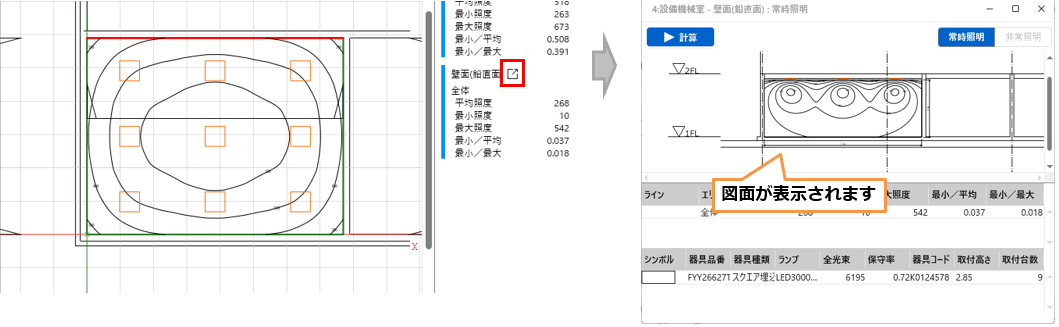 - 画面右側の計算結果欄にある計算面(例:壁面(鉛直面))のフローティングボタンから図面が表示されているのが確認できます。