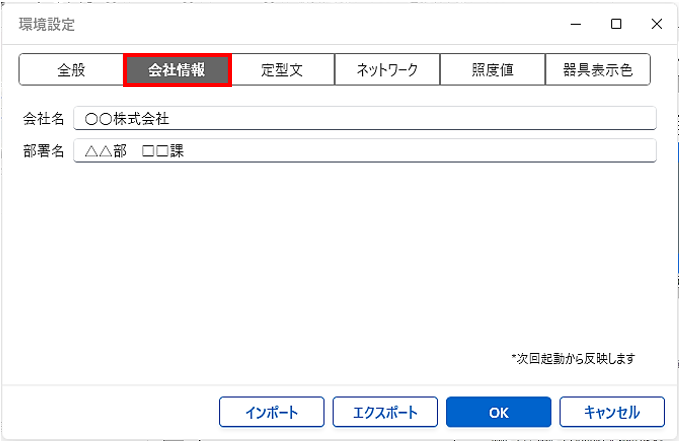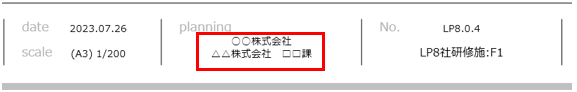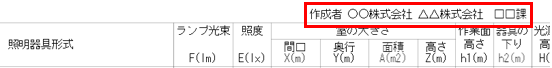 第7章 その他の機能7.6 環境設定 会社情報 照度分布図や照度計算書に[作成者]として表示される内容を設定できます。 照度計算書の場合 照度分布図の場合 ■「NO.」について ルミナスプランナーのバージョンとファイル名の先頭から12 バイト(※)までを表示します。 ※半角1 バイト、全角2 バイト