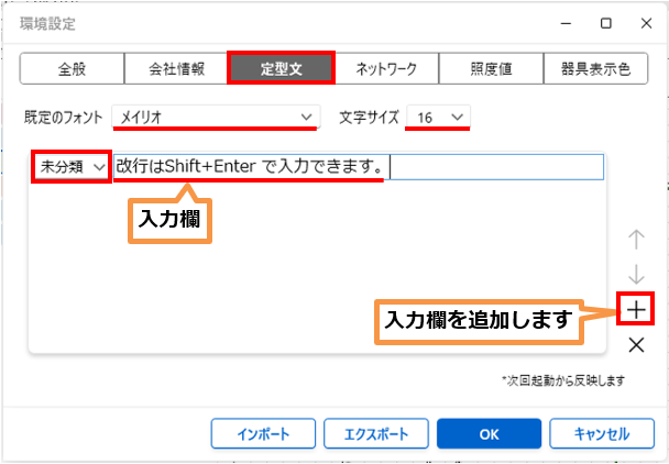 第7章 その他の機能7.6 環境設定 定型文 ドキュメントで挿入する定型文を設定できます。 改行はShift+Enter で入力できます。 既定のフォント :定型文を表示するフォントを設定できます。 文字サイズ :定型文を表示する文字サイズを設定できます。 未分類 :分類を指定できます。 ↑↓+× :上下移動と入力欄の追加や削除ができます。