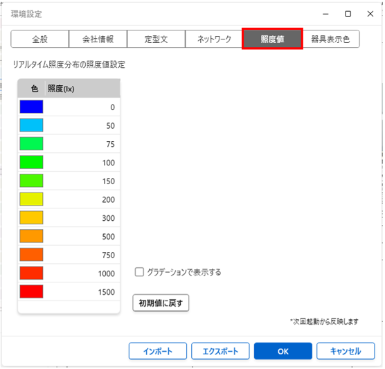 :グラデーション表示すると照度分布の色が緩やかに変化します。