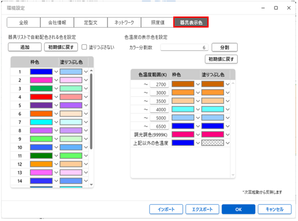 第7章 その他の機能7.6 環境設定 器具表示色 器具シンボルの配色を任意の色に設定できます。 器具リストで自動配色される色を設定 追加 :配色数を追加できます。 初期値に戻す :初期の配色にリセットされます。 色温度の表示色を設定 カラー分割数 :色温度範囲の分割数を指定します。 初期値に戻す :初期の配色にリセットされます。