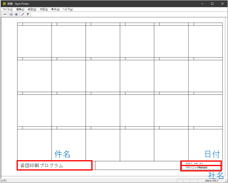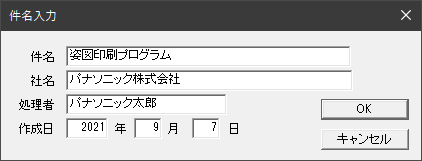 レイアウトする 件名・社名を入力する [姿図]メニューの[件名入力]を選択します。 「件名入力」ダイアログが表示されますので、件名・社名・処理者・作成日を入力して[OK]を押してください。 「ページ設定」ダイアログで、[件名・社名を表示]がチェックされている場合は、図面枠の下部に件名、社名、日付が表示されます。