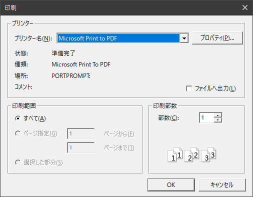 印刷する 「ファイル」メニューの「印刷」を選択します。「印刷」ダイアログが表示されます。 [プロパティ]ボタンを押して、用紙サイズやその他、方向を設定することができます。 用紙の設定は、[ファイル]メニューの[ページ設定]の[プリンタの設定...]ボタンで行うことをおすすめします。