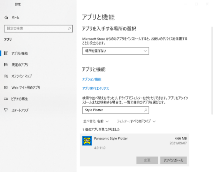アンインストール Windowsの[スタート]メニューの[設定]-[アプリ] -[アプリと機能]を選択して、「アプリと機能」画面を開きます。 「Panasonic Style Plotter」を選択します。 [アンインストール]ボタンをクリックします。 下図のような画面が表示されますので、[アンインストール]ボタンをクリックします。