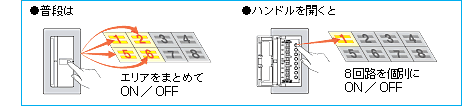 一台二役の押し易いワイドスイッチ■おすすめ場所●施設入口の集中操作部では…コンパクトな個別兼エリアスイッチとして。 よく使う回路のみをエリア対象にして誤操作防止。●各部屋・部位では…ワイドな個別スイッチとして (1回路だけでもエリア対象にできます。)