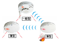 ●親器・子器、煙式・熱式を問わず、1ヵ所で火災を検知すると全ての警報器が連動して警報します。