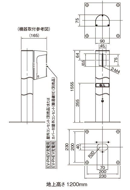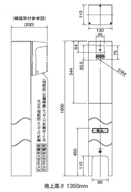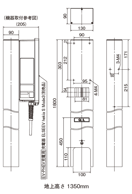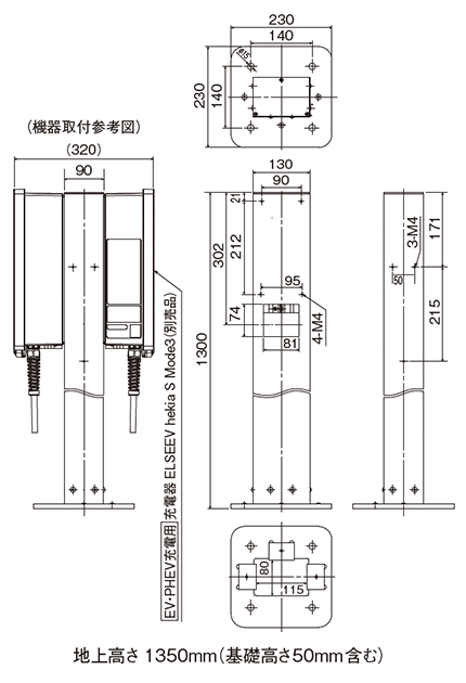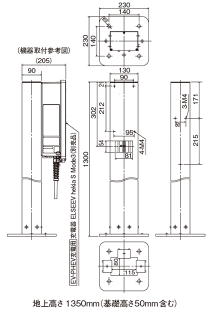 | 設置方法 | ベースプレート方式 ・アンカーボルト固定(別途 M10 140×140mm) ・コンクリート基礎(□300×450mm 地上高さ50mm除く) |