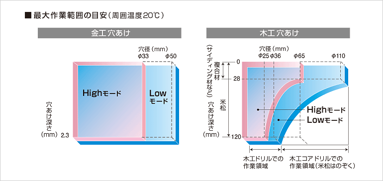 | 能力(目安・フル充電で) | 穴あけ | 《Highモード》ウッディングコアドリル(φ65×窯業系サイディング材16mm+合板12mm)約30穴 《Lowモード》ウッディングコアドリル(φ110×窯業系サイディング材16mm+合板12mm)約10穴 《Highモード》金工ドリル・SPC(φ13×1.6mm、金工φ6.5下穴あり)約220穴 《Highモード》ホールソー・SPC(φ21×1.6mm)約30穴 《Highモード》ホールソー・SPC(φ25×1.6mm)約25穴 《Highモード》ホールソー(φ50×石膏ボード16mm+合板12mm)約45穴 《Highモード》木工・米松(φ18×120mm)約90穴 |