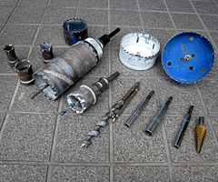 桝谷さんが普段お使いの先端工具。石こうボード・鉄板・ALC用などの各種ホールソー、木工ドリル、多段ドリルなど、穴あけに使う道具が多数を占めています。