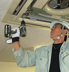 ビルなどの施設用から一般の家庭用まで、空調設備の施工を幅広く手がけられている桝谷さんは、有限会社エム・エー・エス設備の2代目社長さん。家業を引き継がれてほぼ10年、“最初は工具類の扱い方さえわからなかった”そうですが、いまではすっかりこの道のプロ。14.4Vリチウムイオン電池搭載のドリルドライバーが右腕です。