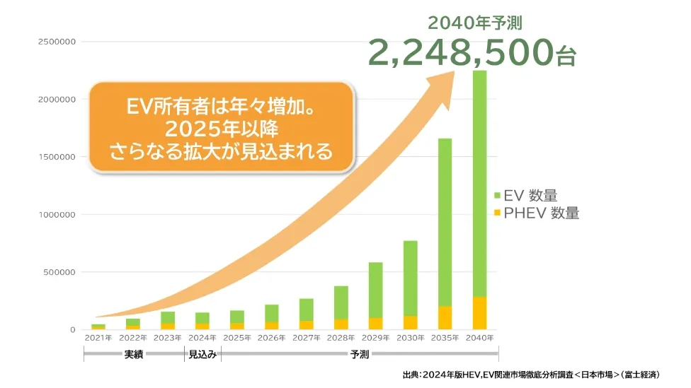 2030年には年間約80万台と、現在の約5倍に迫る成長が見込まれ、電気自動車(EV)が一般的な選択肢として浸透するフェーズに入ります。また、2040年には約224万台まで拡大する見込みです。