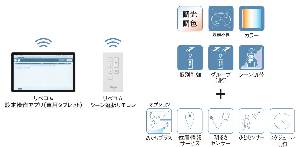 LiBecoM(リベコム)は、照明の調光・調色に加え、音響や空気清浄機とも連携する無線制御システムです。