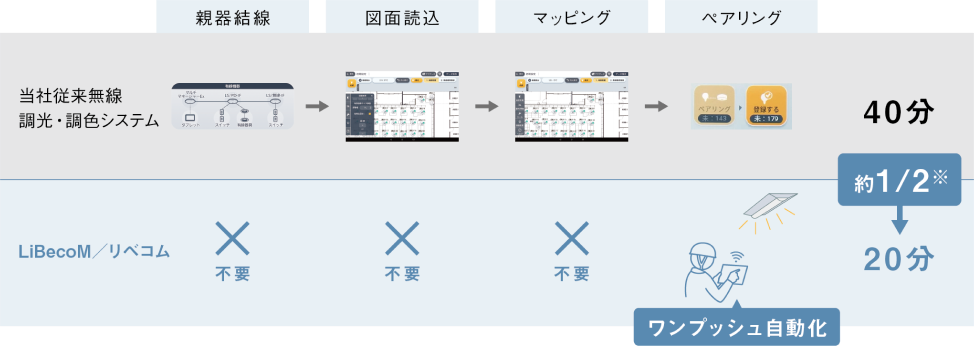 無線照明だから、図面読込などの細かい設定は不要。ワンボタンで自動でペアリングできます。