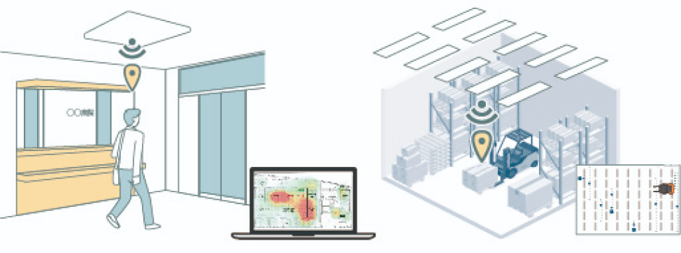 照明にビーコンを内蔵し、人やモノの場所を位置情報検知し、現場の課題解決が可能に。天井からの信号発信で検知精度も良好で、電池交換が不要です。