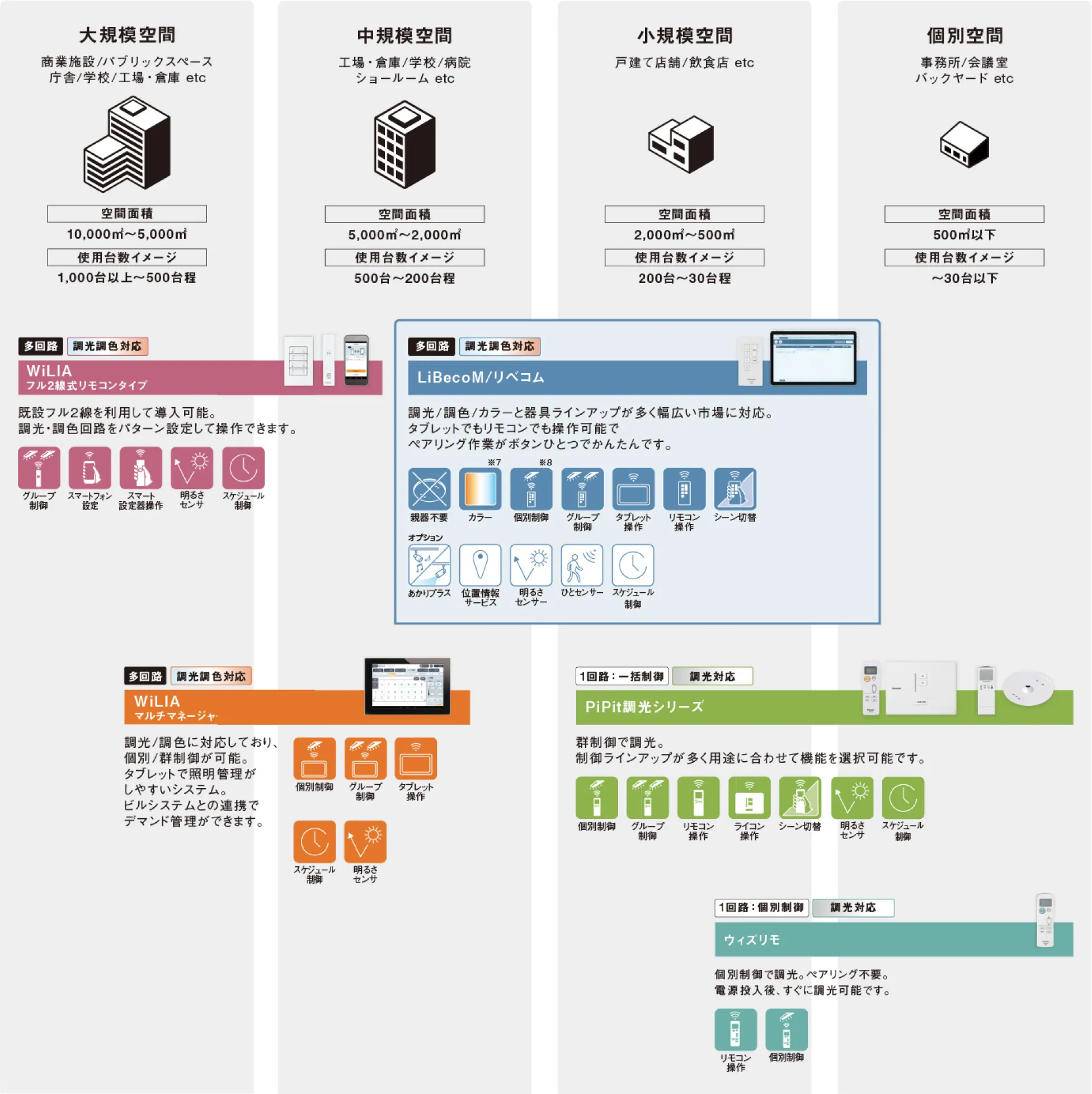 パナソニックの無線調光調色シリーズは「LiBecoM(リベコム)」をはじめ、「WiLIA(ウィリア)」「PiPit(ピピッと)調光シリーズ」「ウィズリモ2」がございます。他商品と比較しながら、LiBecoM(リベコム)の施設規模や仕様をご確認いただけます。