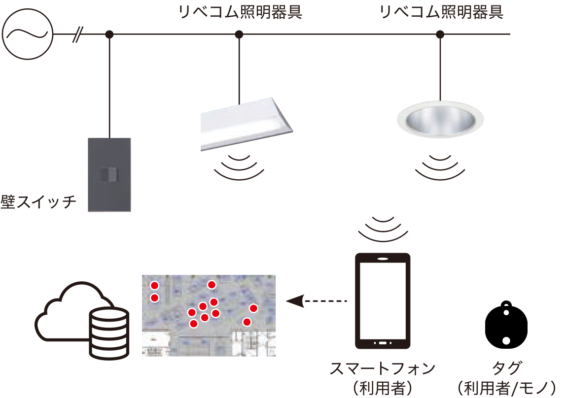 照明器具(リベコム)から発信されるビーコン信号を利用者のスマートフォンやタグで受信します