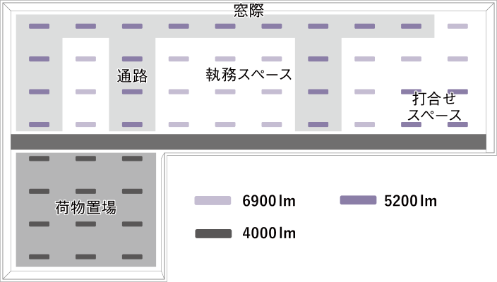 ※一体型ベースライト ウィズリモ2を52台使用(6900 lm:18台、5200 lm:22台、4000 lm:12台)の場合
