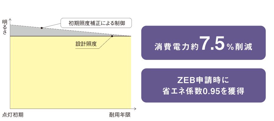 光源初期の過剰な明るさを抑え、適正な明るさに補正して自動的に節電する「初期照度補正機能」を標準で装備しています。