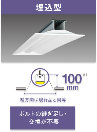 蛍光灯照明器具からのリニューアルを考慮した寸法設定で吊りボルトがそのまま使用可能
