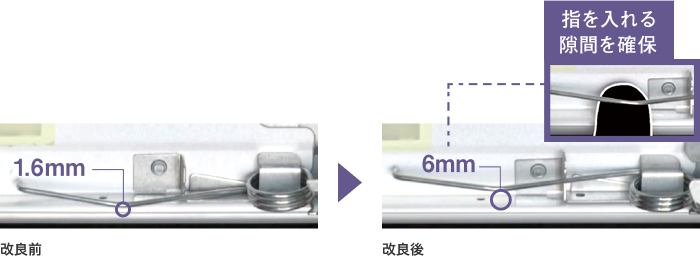 引掛け金具の設計を見直し、より軽い力で金具を引き出せるよう改善しました。