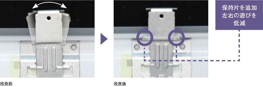引掛け金具の強度アップと、ぐらつきを防ぐための保持片を追加。左右の遊びを少なくすることで、ライトバーを吊るす際、本体角穴への引掛け作業がスムーズに行えます。