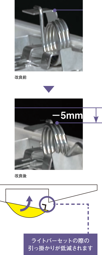 バネ取付金具の高さを低くすることで、ライトバーと本体の隙間を十分に確保しライトバーをセットする際に引っ掛かる可能性を低減しました。