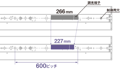 調光タイプの600ピッチ取付が可能に。器具内送り配線の収納性も改善。