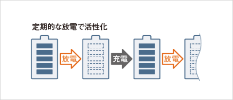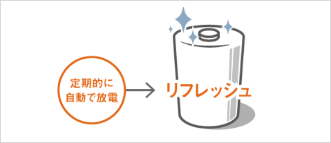 バッテリーは定期的な放電で活性化され、適正な状態で使用することができます。新たな点検方式では6ヶ月以内に1回自動で放電を行うので、万が一の災害時に備え元気な状態を保つことができます。