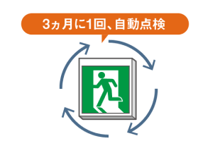 消防法で定められている定期点検「6ヵ月に1回」に対して、「みるだけバッテリーチェック」機能は3ヵ月に1回、自動で蓄電池により誘導灯を点灯し、点検を実施。定期的に放電が行われることで蓄電池の性能維持につながります。