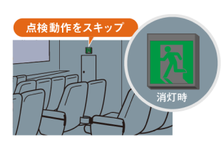 劇場や映画館など利用形態により誘導灯を点灯させたくないケースでは、消灯信号を受けることで自動的に点検動作をスキップします。 消灯信号を受けなくなれば、再度点検動作を行います。