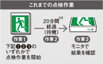 これまでは❶ブレーカーの遮断❷点検スイッチ❸リモコンの操作により点検を開始していたものが、これからは器具が自動で点検を開始。結果をモニタに表示するので、みるだけでバッテリーの状態確認をすることができます。 ※従来の点検方法でも確認いただけます。