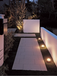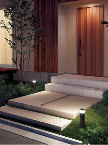 アプローチのあかりは足元をやさしく照らします。防犯対策のため、暗がりを作らないことがポイント。