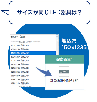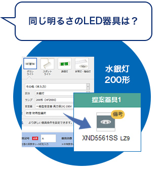 従来器具の明るさ表記を選ぶだけで、対応するLED器具に自動で置き換え!