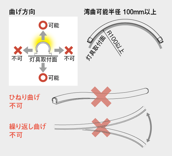 無理な方向への折り曲げ、折り返しての折り曲げは、灯具の破損の原因となりますのでご注意ください。