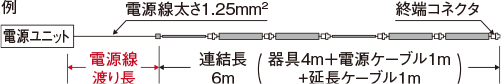 器具4m連結し、その間に電源ケーブル1m及び延長ケーブルを1m使用した場合、連結長は6mとなります。電源線に1.25mm2を使用する場合の電源線渡り長は「20.2m」となります。