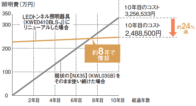 - 算出条件:トンネル延長400m 設計速度40km/h 日交通量1万台未満保守率:0.70 野外輝度:2500cd/m2灯具間隔は、従来品は道路照明施設設置基準・同解説(昭和56年 日本道路協会)により、LEDは最適計算値とする。