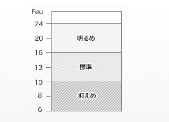 図1に「事務所・会議室におけるFeu値の目安」を、図2に「照明工夫によって空間の明るさを向上させた例」を、図3に「空間の明るさを確保しやすい天井直付型照明器具の例」を示します。