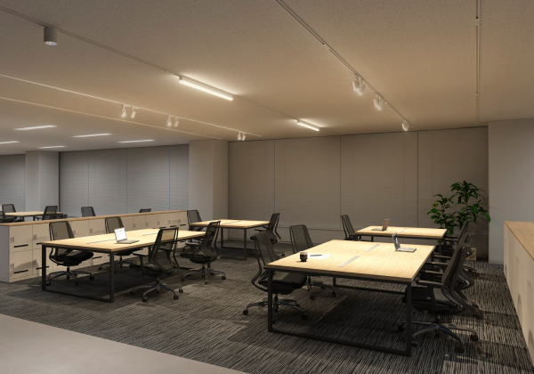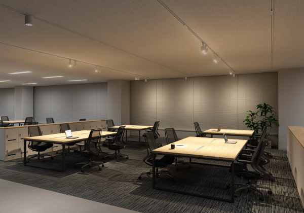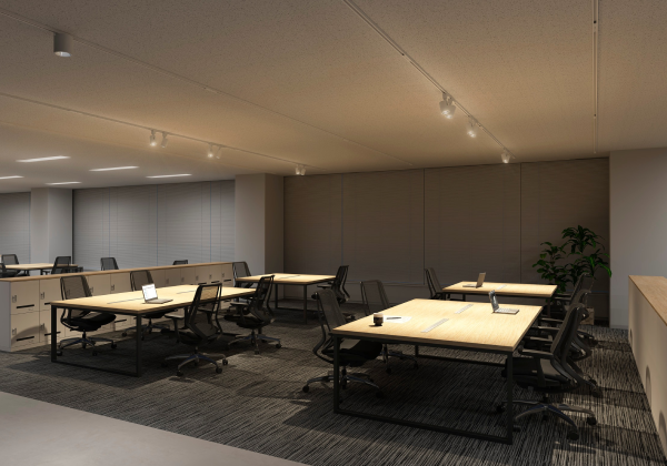 執務室は、日常的に長時間のデスク作業が想定されることから、陰鬱な印象を回避することも重要です。水平面の照度値が同じ空間でも、壁面や天井面を明るくする(輝度を確保する)ことによって、空間の明るさを効果的に確保することができます。