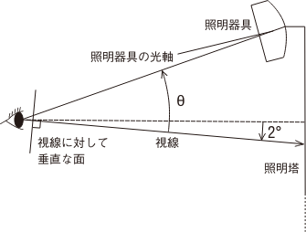 図1:グレア評価のための視線方向、照明器具及び照明塔の位置関係