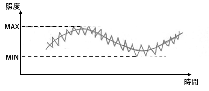 従来の照明器具はたびたびフリッカを発生しておりましたが、近年用いられているLED照明においては人間の目でフリッカを感じることは少なくなっています。しかし人間が瞬時と感じるような時間であっても図2にあげますように、照明器具の光出力は時間とともに流動しています。フリッカファクターFfは、その瞬時の中での光出力の最大値Emaxと最小値Eminによって求められます。