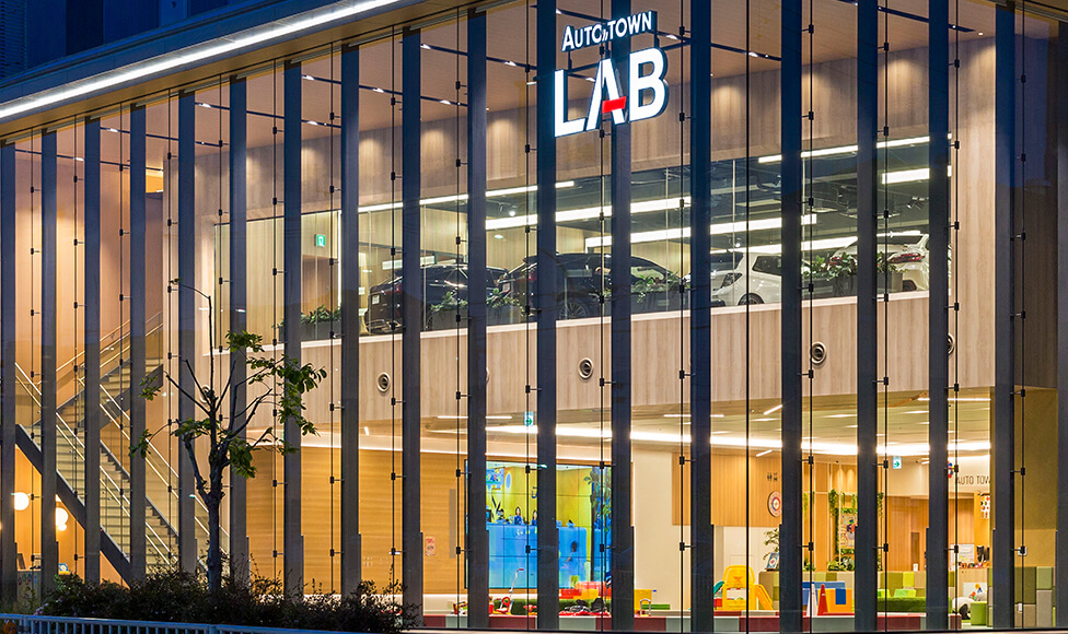店舗棟と駐車場棟の2棟からなる本施設は、ATグループ本社を核とする「オートタウン高辻~人とクルマが集う街~」の一角に位置している。このエリアにはATグループに関連する個性的な自動車販売店舗が多く建ち並ぶが、本施設は「新たな価値を生み出し提供する場-ラボ-」として、他店舗とは異なる個性を醸し出す新たなスタイルの店舗となっている。