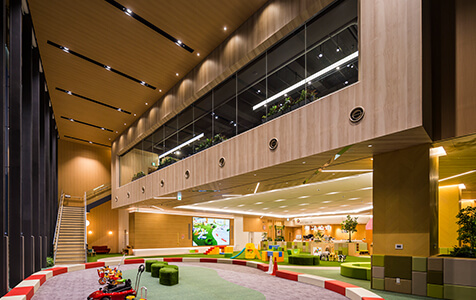中央の芝生広場は天井を空に見立て、折上げ天井を間接照明で優しく照らし出すことで下部に心地よい滞留環境を生み出すことを意図した。パーティールームにはSmartArchiのソフトライトを採用し、器具の存在感やまぶしさを抑え、やわらかい印象の空間を演出した。
