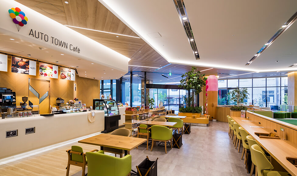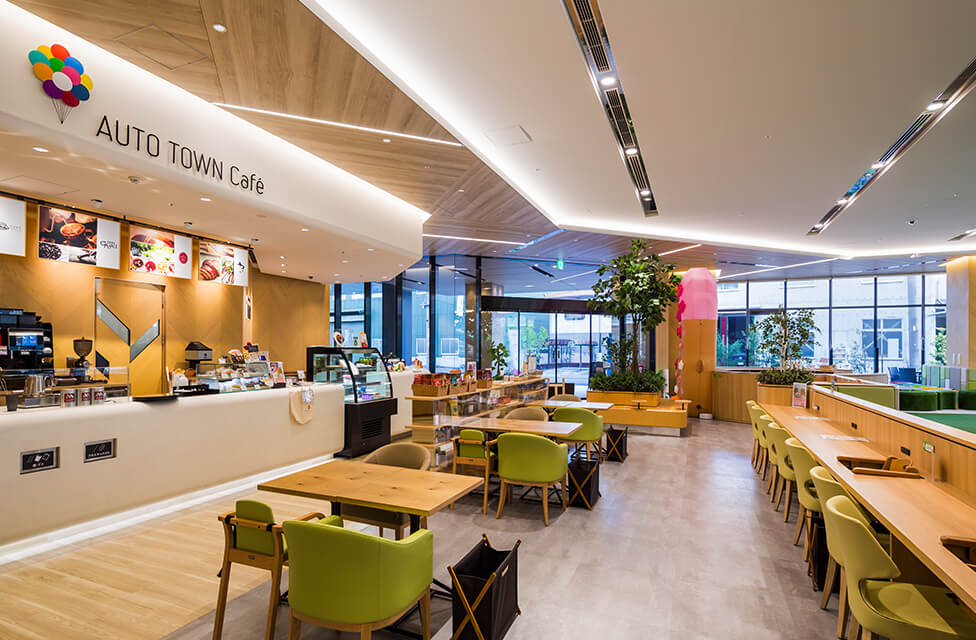 車の購入プロセスや利用形態は情報化社会の発展と共に大きく変化し、多様化が加速している。本施設は、それら時代の変化に応対するチャレンジの場として、ATグループ本社を核とする「オートタウン高辻~人とクルマが集う街~」の一角に計画された。建物は店舗棟と駐車場棟で構成され、主機能を担う店舗棟の1Fには「カフェ併設型キッズパーク」を設置している。