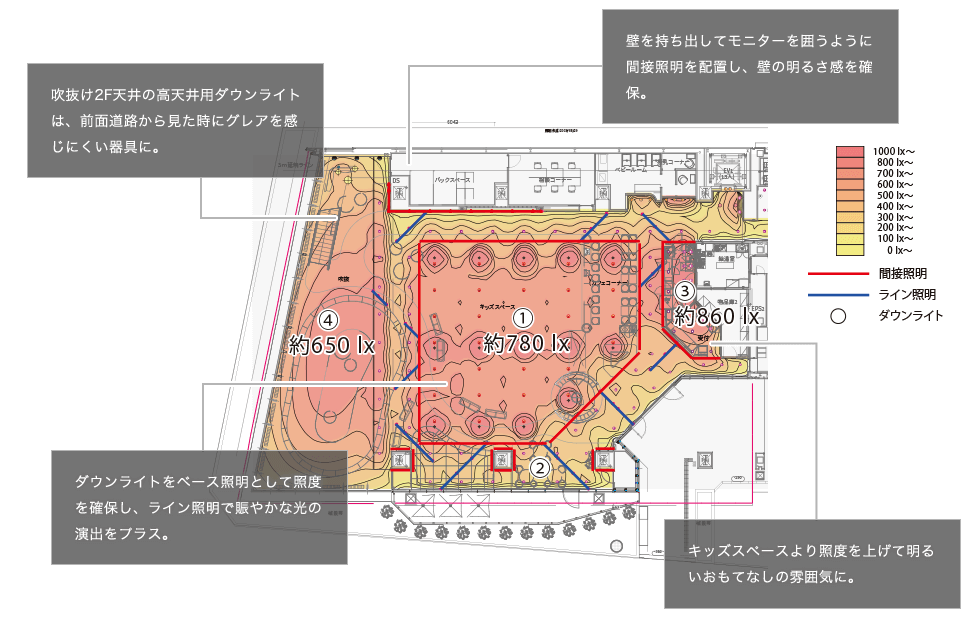 前面道路に面するオープンな吹抜空間を設け、異なる空間性(=店舗の特徴)が外部からもダイレクトに感じられる計画とした。2F天井に光源遮光角15°の銀色鏡面仕上ダウンライトを採用し、黒色の天井スリット内に設置することでグレアに配慮している。間接照明が店舗奥へと視線を導くと共に、空間に広がり感や賑わい感を与えている。夜間は道路から店舗内部が目立つようにもなっている。