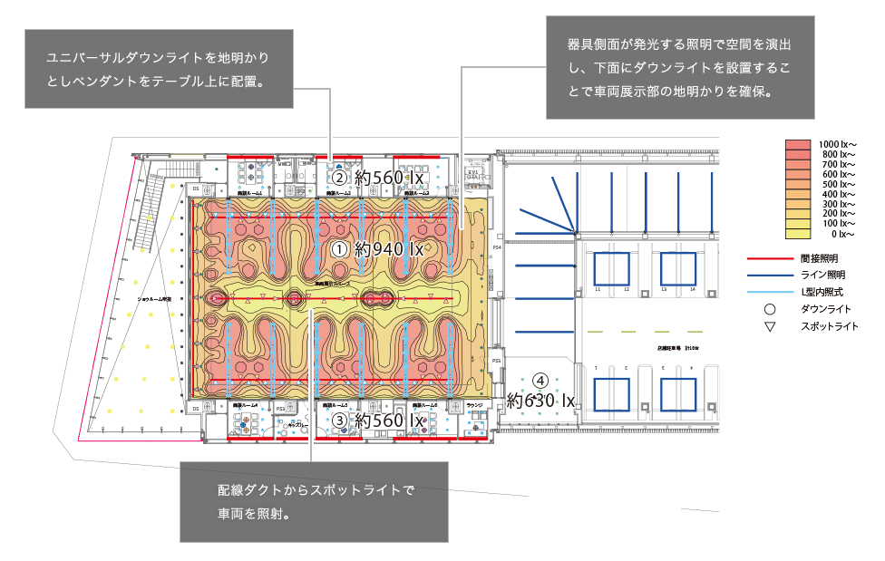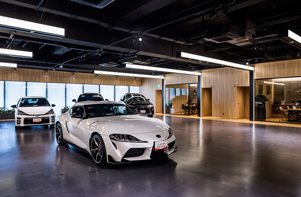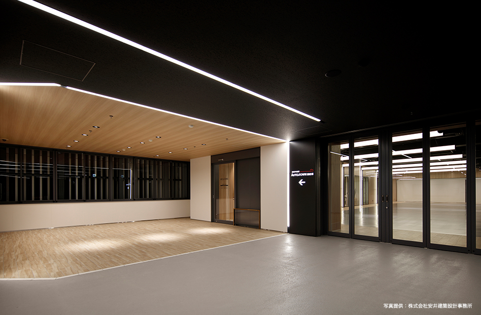 2Fは約17m×26mの無柱展示空間に、完成車両の最終検査ラインをイメージしたL型内照式照明が連続する”車を魅せる”空間演出とした。L型内照式照明には、色温度3500Kのダウンライトを組み込むと共に、ライティングレールにて車両照射用に色温度4000Kのスポットライトを適所に設置することで、車両展示空間としての機能性や快適性にも配慮した。スポットライトは配光調整機能付きと車への映り込みに配慮したグレア低減レンズを併用した。