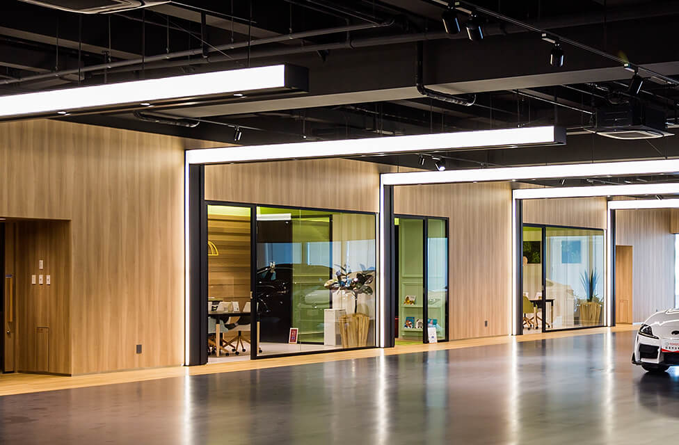 ガラス張りの商談ルームはベース照度を少し落とすことでガラス面への映り込みを抑制し、室内から購入検討車を確認しながら快適に商談を行うことができる。