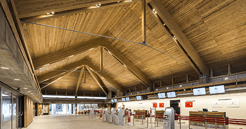 「みやこ下地島空港ターミナル」では、エコの取り組みとして、空港ターミナルとしては初めて屋根の構造材にCLT(直行集成材)を採用。沖縄県が定める地域材を使用し、地域の森林・林業再生へ貢献している。