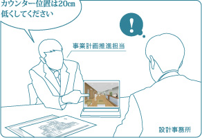 設計者の意図を3D空間で瞬時に理解できます。また、空間設計や意匠をシミュレーションできるので、スタッフの総意を具体的にフィードバックできます。
