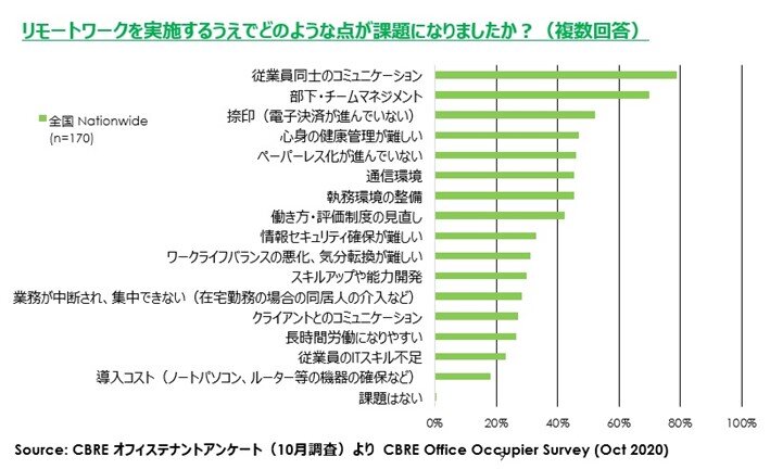 ただ一方で、デメリットも実感しています。「リモートワークを実施する上でどのような点が課題になりましたか?」という質問では、「従業員同士のコミュニケーション」「部下・チームマネジメント」「捺印(電子決済が進んでいない)」「働き方・評価制度の見直し」などの回答とともに、「心身の健康管理が難しい」という項目を挙げ、どれも40%以上の回答者が課題に感じていると答えています。