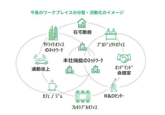 「センターオフィスは、どこからも比較的アクセスが容易な場所に、営業拠点は顧客に近いエリアに、その他、その日の都合に合わせてサテライトオフィスやコワーキングスペースを活用、育児や介護など個々の状況に応じて在宅ワーク、カフェやジム、出張先、移動時間など、ワークプレイス・ワークスタイルの選択肢が広がる時代が来ます」